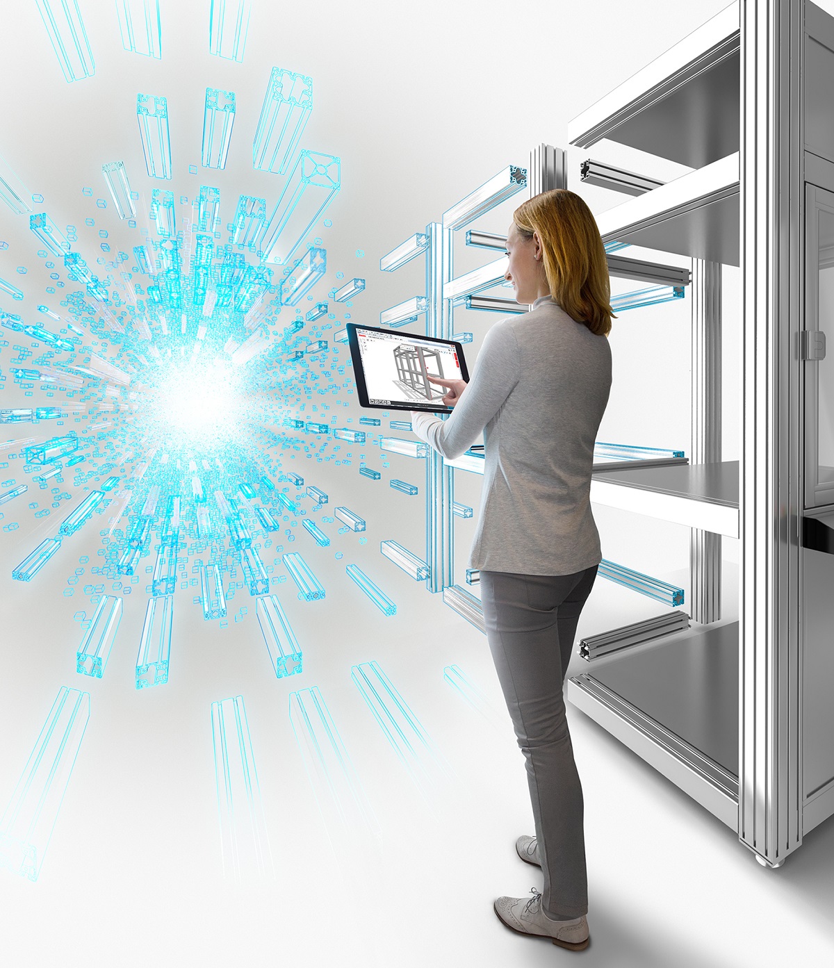 The item Engineeringtool lightens the workload for engineers. A good example of this is the process of adding caps or covers to the profile ends in a design, which usually involves searching through an extensive catalogue to track down the right size of cap for each profile one by one. In the item Engineeringtool, however, users only have to select the desired cap once, which they can then drag onto the ends of various profiles, at which point it immediately and automatically adapts in size. If users add floor elements such as Swivel Castors, they don’t have to specify any screws or other fixings. “The item Engineeringtool automatically knows which small parts are needed to fix components in place,” says Thiel. “This way, users can focus entirely on the engineering tasks at hand.” Repetitive engineering steps are easy to carry out, too. For instance, relevant components can be selected and duplicated with a simple double click, making it possible to create basic frames in next to no time. To connect individual components with absolute precision, users can enter exact length values for each component using their keyboard and use a lock function to keep components at the specified dimensions. The design can be viewed from various different angles, as the display can be rotated in all directions. Once the design is complete, all the components are listed in a summary, which can be used to subsequently change individual components or entire designs, such as the colour and design of the profiles or the type and number of grooves.