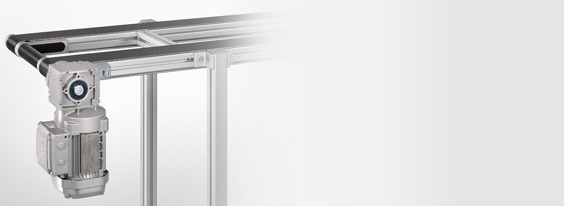 To achieve the optimum belt speed, the item Conveyor Belt System features two Motor and Gearbox combinations with a variety of gear ratios. Motor AC D16 has a high efficiency rating of IE3 and an integrated Spiroplan® gearbox. When using Motor AC D11 from item, however, the electric Motor and Bevel Gearbox are separate units in the conveyor belt drive system. This makes it easier to convert a conveyor line for different speeds.